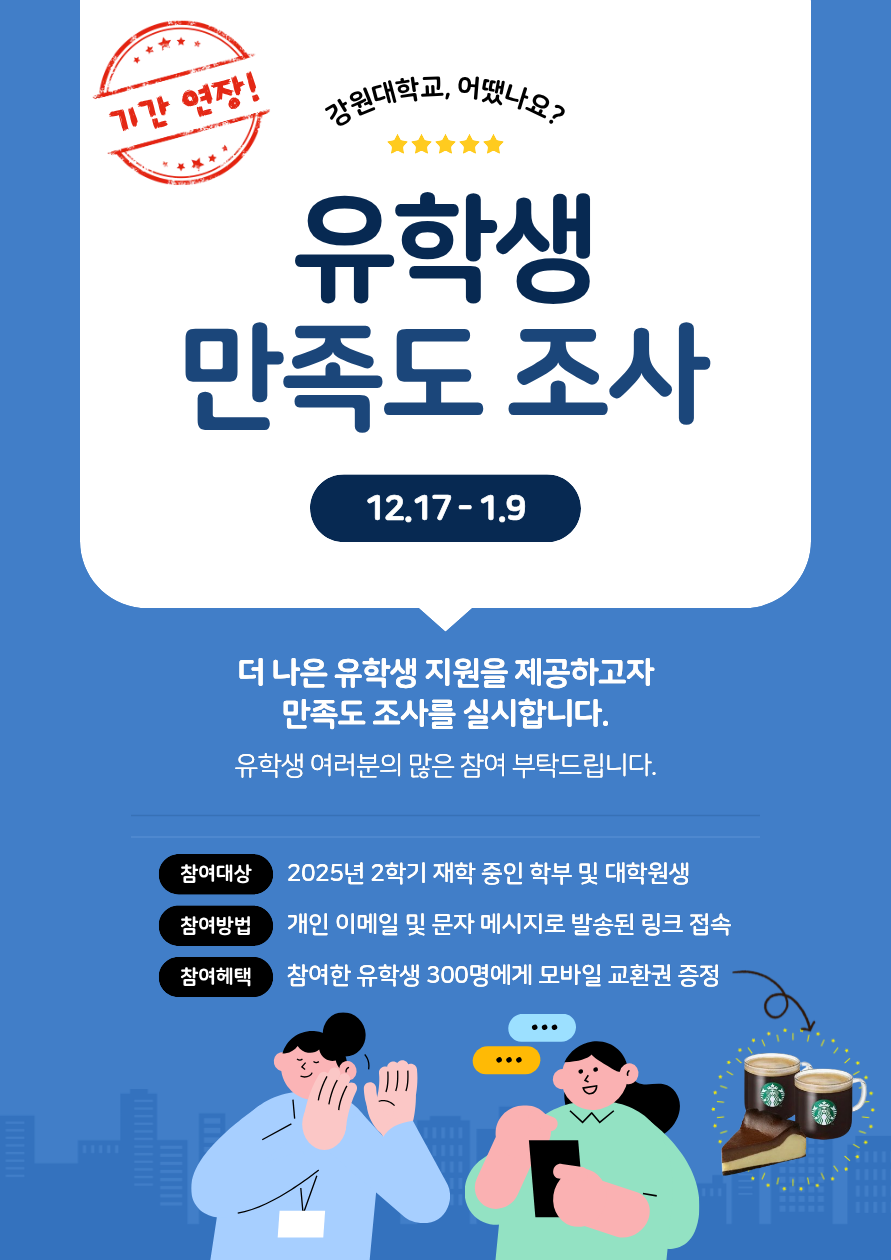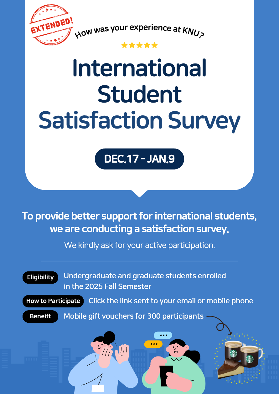 [공지] ★ 2025 유학생 만족도조사 기간 연장! (~1.9) / 2025 International Student Satisfaction Survey Period EXTENDED! (~Jan 9) ★